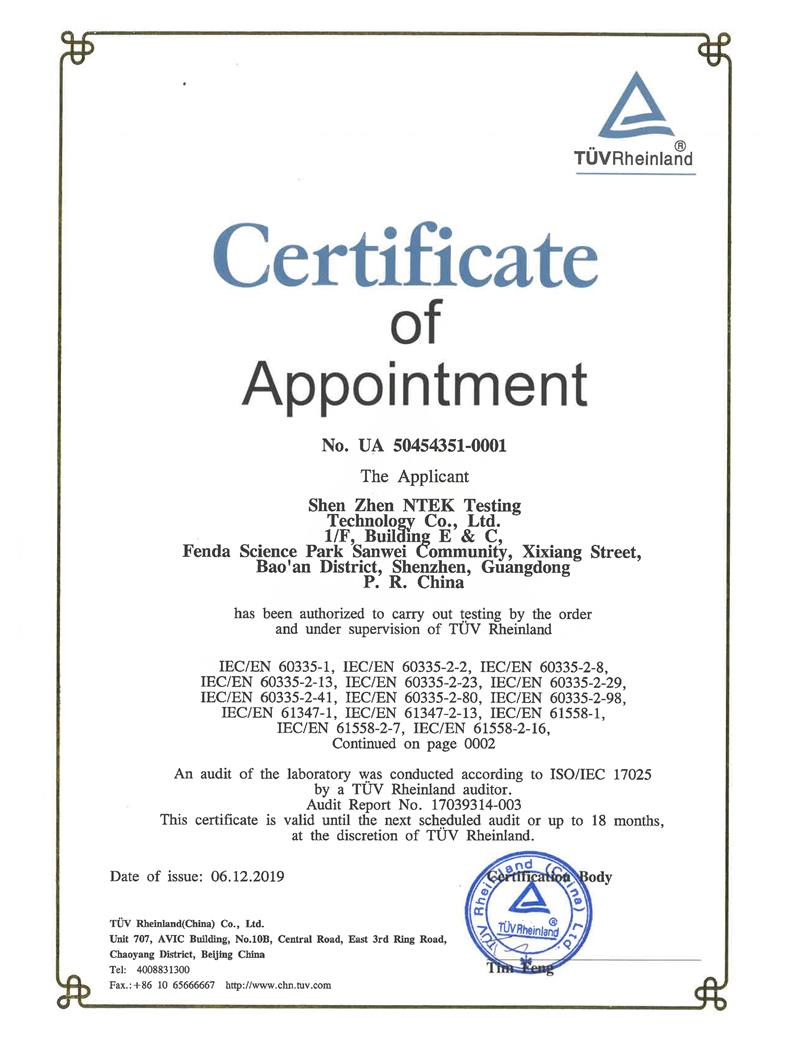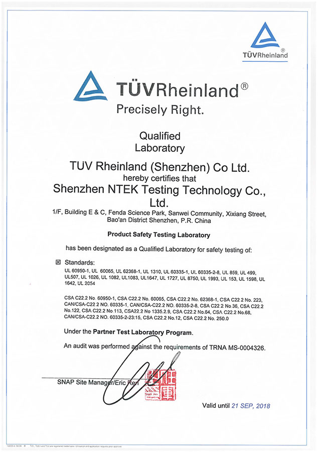 获得美国CPSC、UL、FCC、CEC、ETL、MET、TIMCO、德国TUV、EMCC、PHOENIX、英国ITS、澳洲SAA、加拿大CSA、IC、挪威NEMKO、韩国电器科学研究院(KTC)等国际机构认可授权...